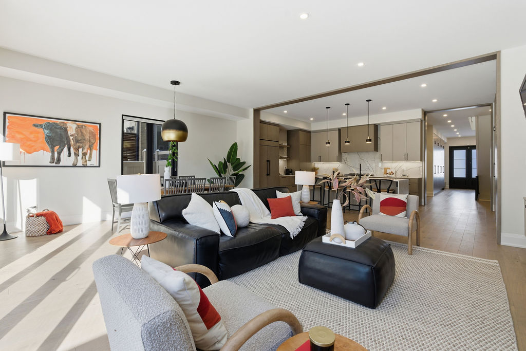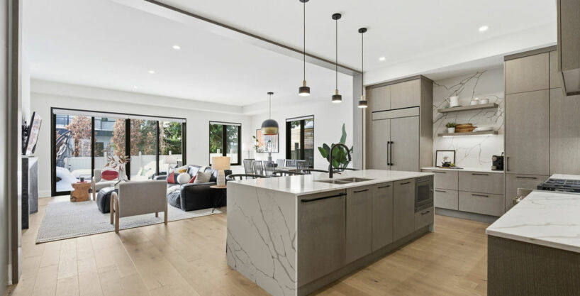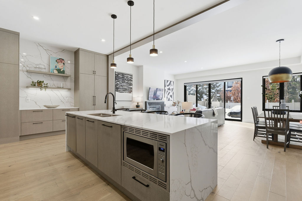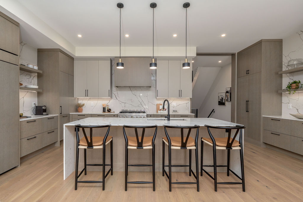 The kitchen is a true showpiece, designed for both everyday living and entertaining. It features quartz countertops and backsplash, integrated appliances, a six-burner gas stove with a built-in hood fan, and an impressive waterfall island at the centre. Ten-foot ceilings, warm engineered hardwood floors, refined finishes, and abundant natural light create an airy, upscale atmosphere throughout. Every detail has been carefully considered, including custom built-ins and Hunter Douglas blinds that keep the space clean, organized, and serene.