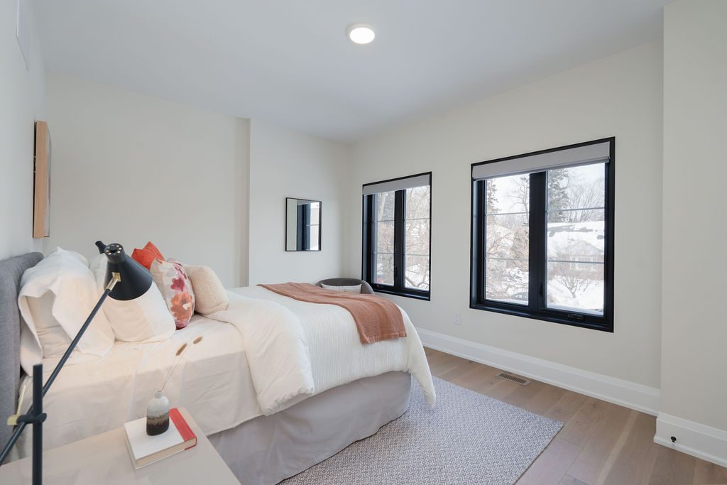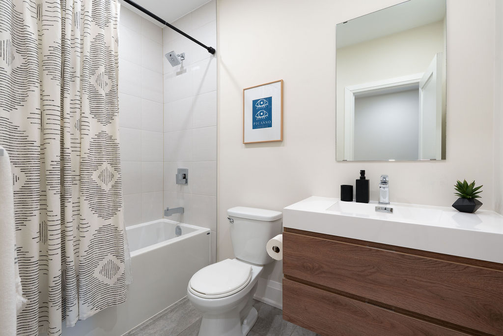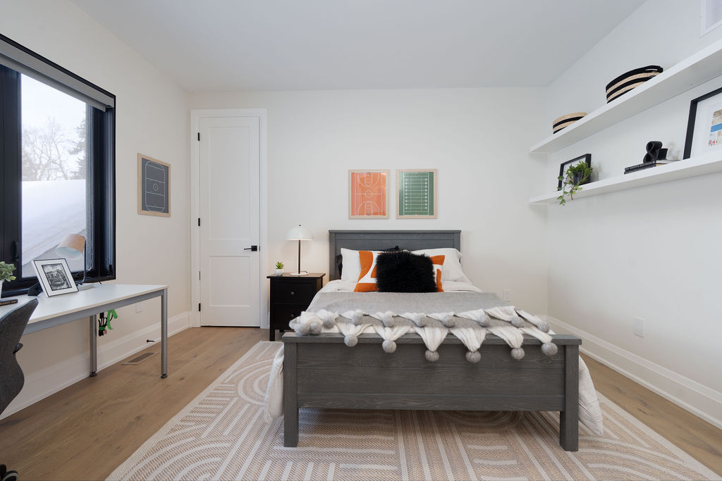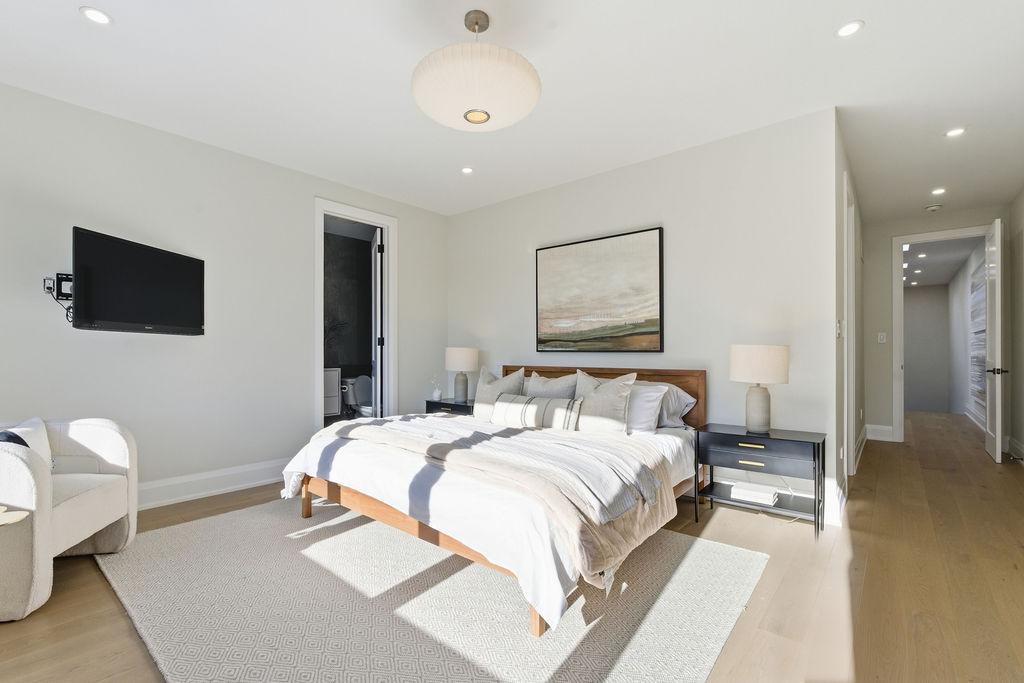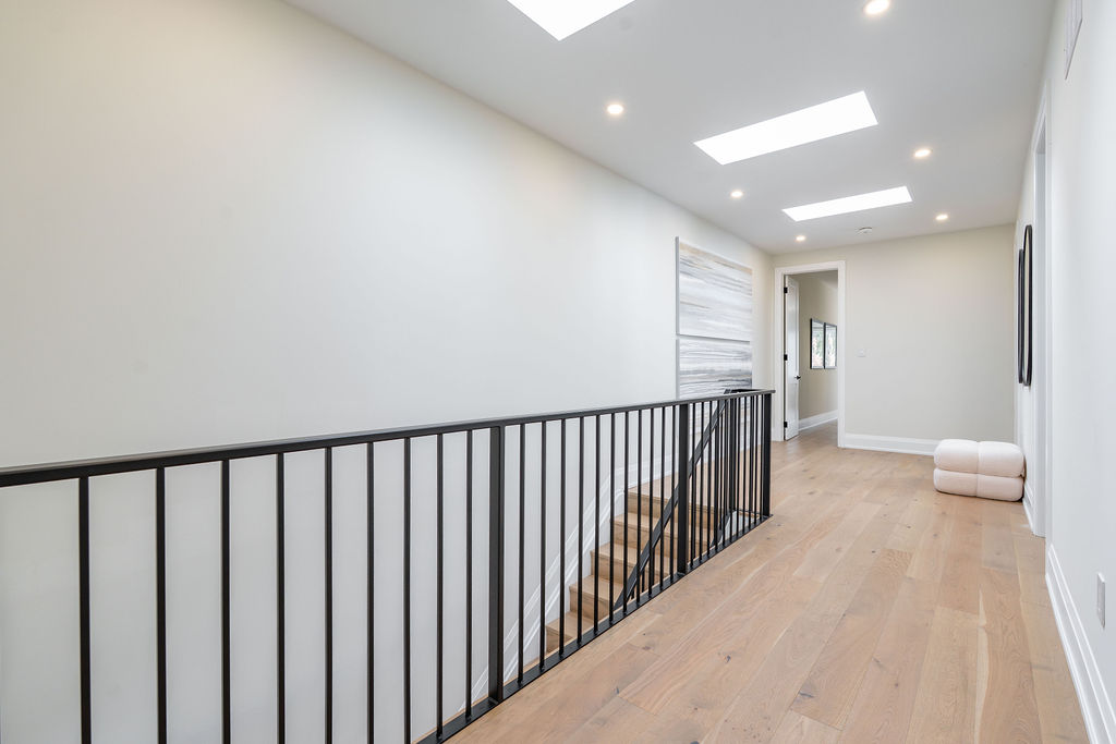 Upstairs, nine-foot ceilings and three skylights flood the space with natural light. The primary retreat features oversized windows, a custom walk-in closet, and a spa-inspired five-piece ensuite with a floating vanity, quartz countertops, a deep soaker tub, and a glass-enclosed shower. All four bedrooms are generously sized, with large windows and access to full bathrooms, including a convenient Jack and Jill, making this an ideal layout for families.