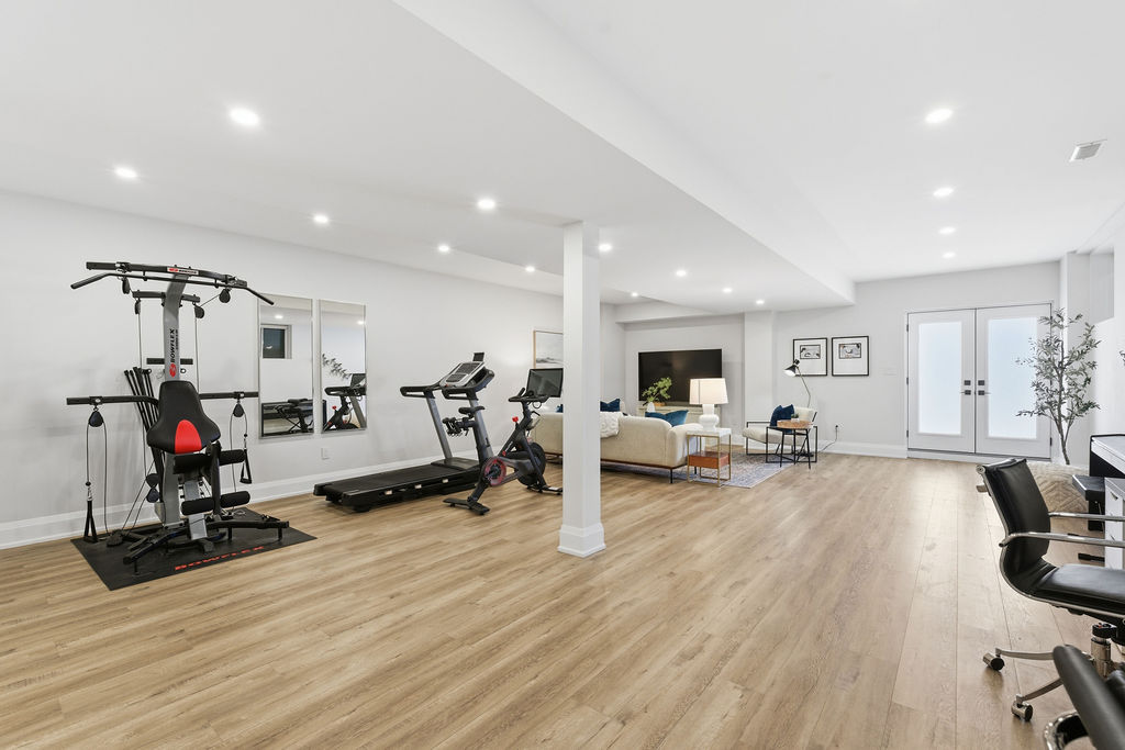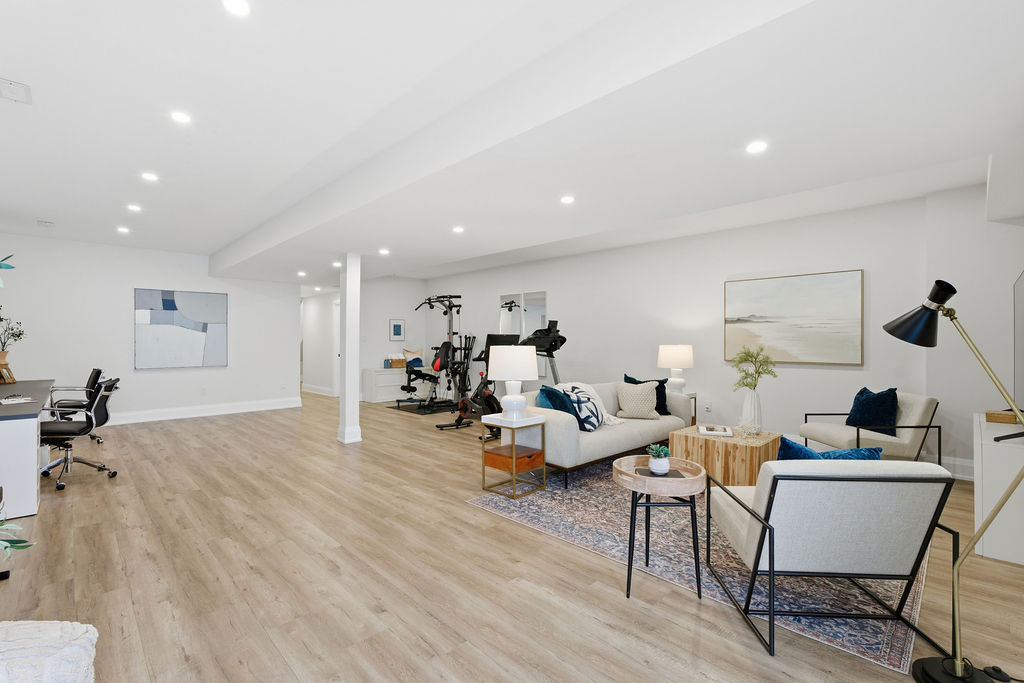 The finished basement offers a bright, open canvas with nine-foot ceilings, large windows, pot lights, vinyl flooring, a full bathroom, and an extra-wide walk-out to the backyard, making it perfect for recreation, guests, or additional living space. Outside, the multi-tierred stone backyard with a large awning is designed for entertaining, while the landscaped front yard with realistic turf ensures year-round curb appeal. A mudroom off the garage with tiled flooring, quartz countertops, and custom storage, along with a long garage offering extra space, completes this exceptional home that balances luxury with everyday comfort.